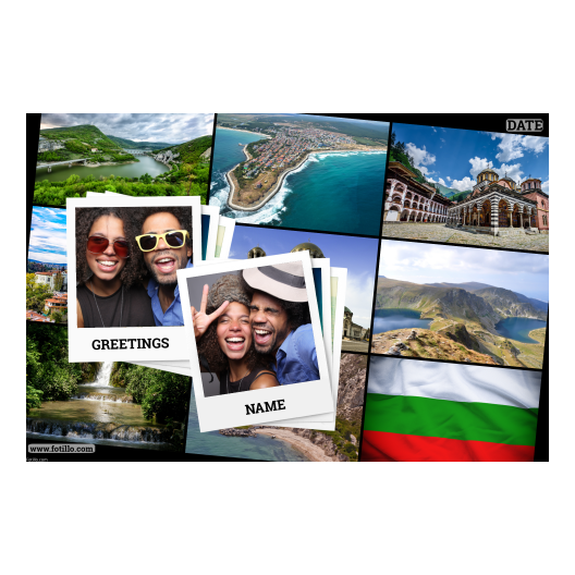 Bułgaria to wspaniały kraj, dla którego stworzyliśmy tę pocztówkę. Tło składa się z kilku zdjęć na których są budynki i flaga.
