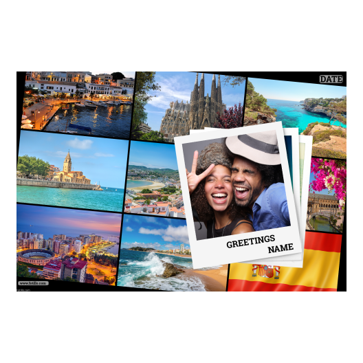 Czy znasz wszystkie miejsca w Hiszpanii pokazane na zdjęciach w tle? Nasz projekt pocztówki świetnie się sprawdzi w Hiszpanii do tworzenia spersonalizowanych pocztówek!