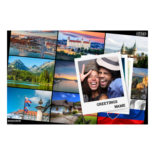 Słowacja to wspaniały kraj, dla którego stworzyliśmy tę pocztówkę. Tło składa się z kilku zdjęć na których są budynki i flaga.