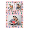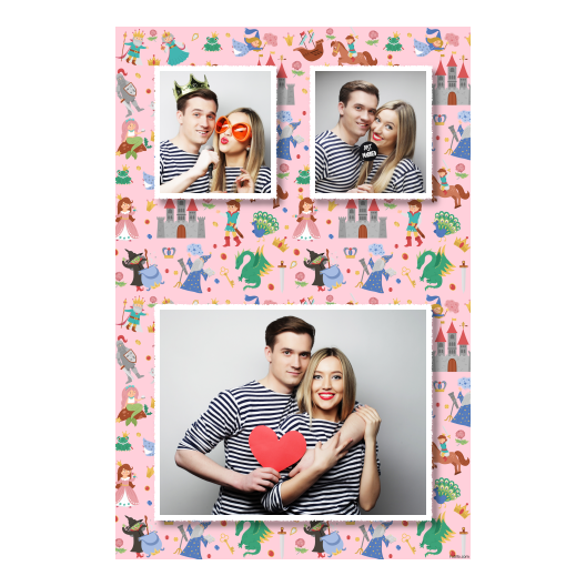 Shows 3 photos, that compose on the pink background.
