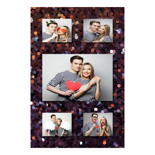 Shows 5 photos, that compose on the black background.