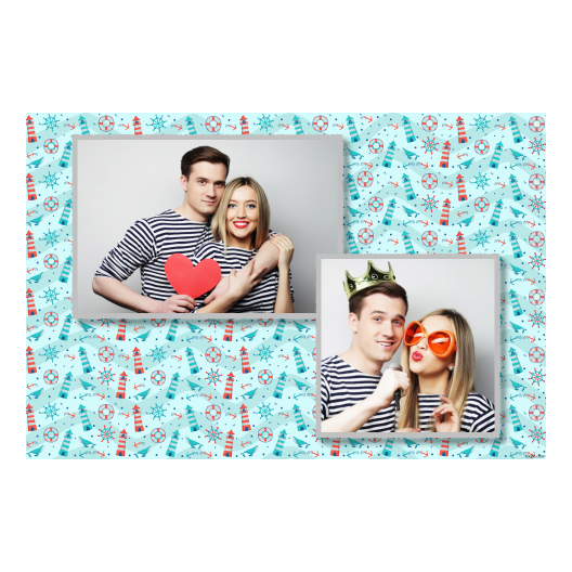 Shows 2 photos, that compose on the light blue background.