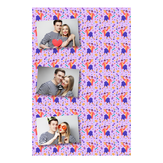 Shows 3 photos, that compose on the violet background.