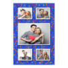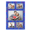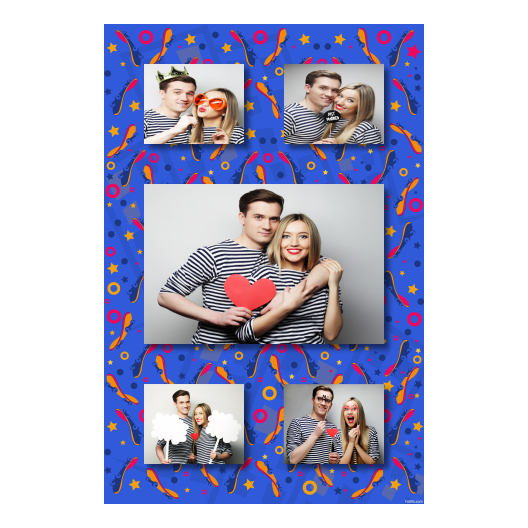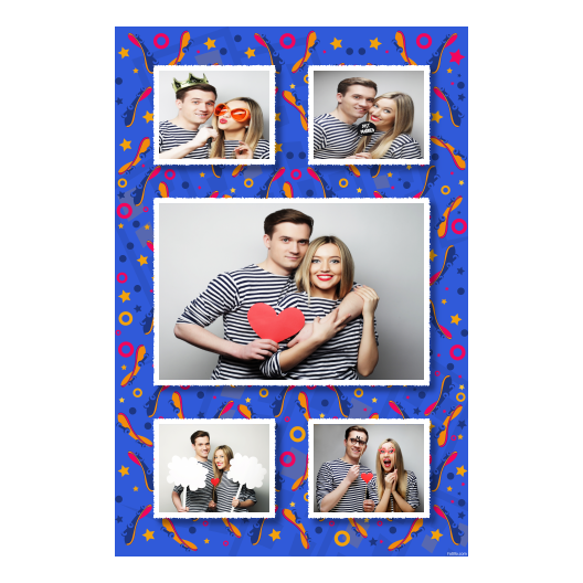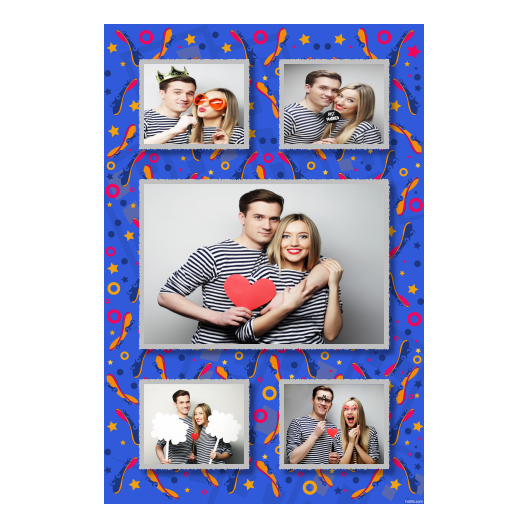 Shows 5 photos, that compose on the blue background.